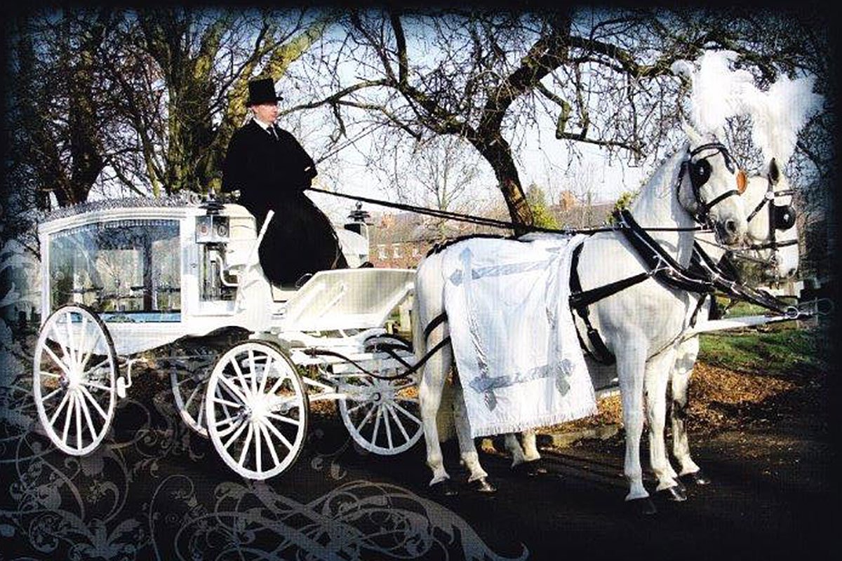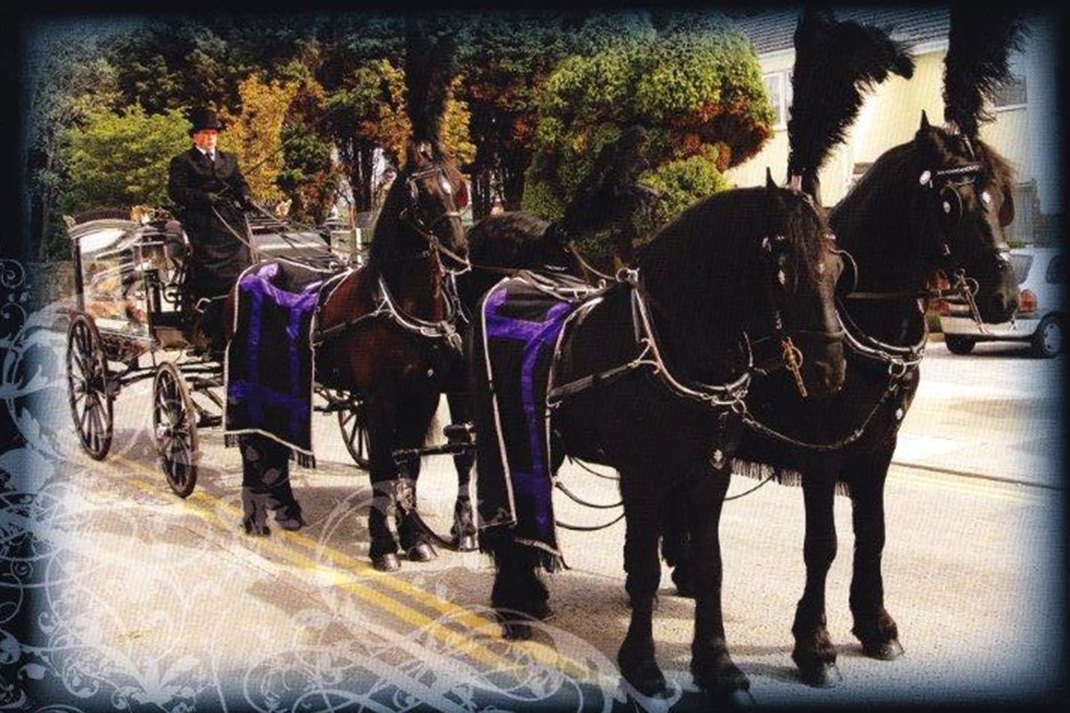 If you would prefer a non-motorised hearse, we also offer a traditional horse-drawn alternative to transport the coffin and floral displays. Finished in black, you can opt for the hearse to be pulled by a team of either black or white horses.